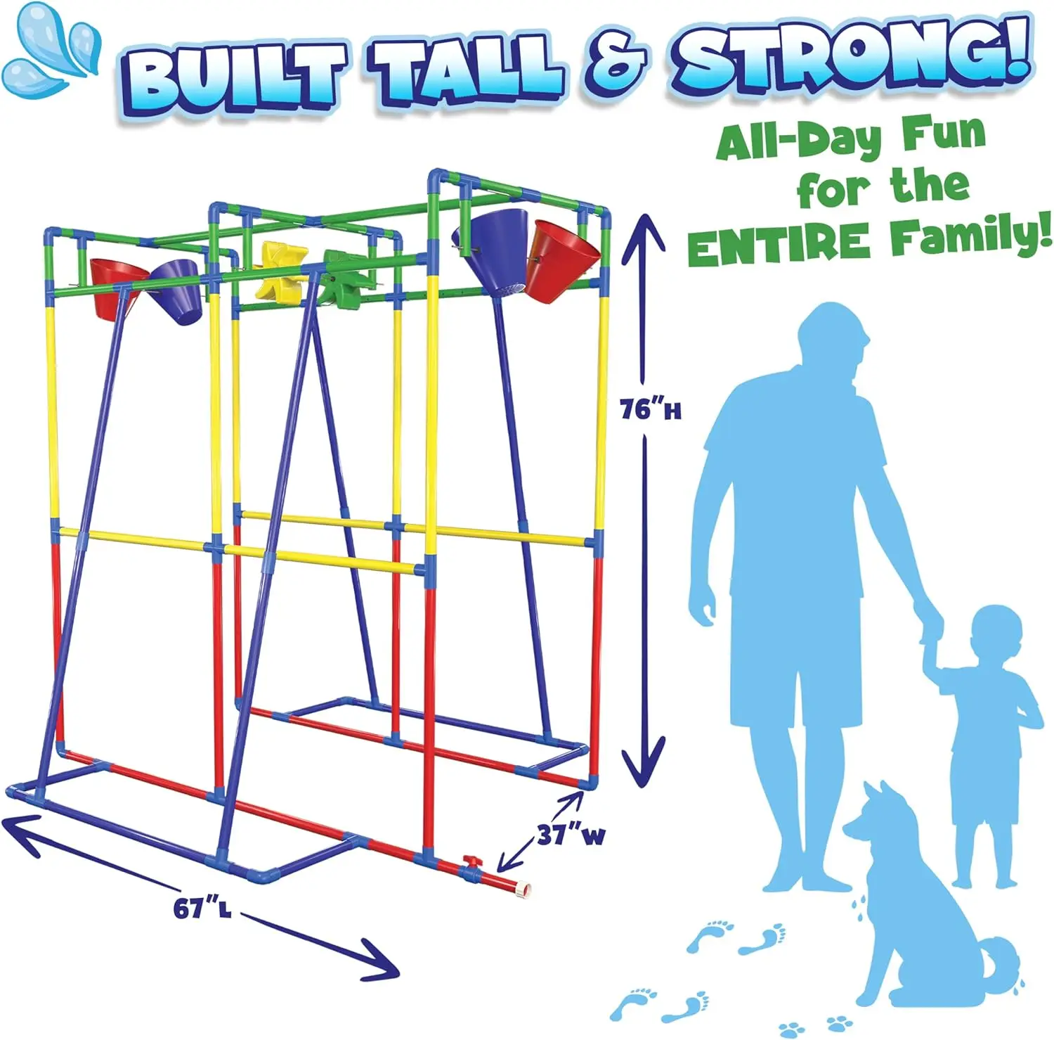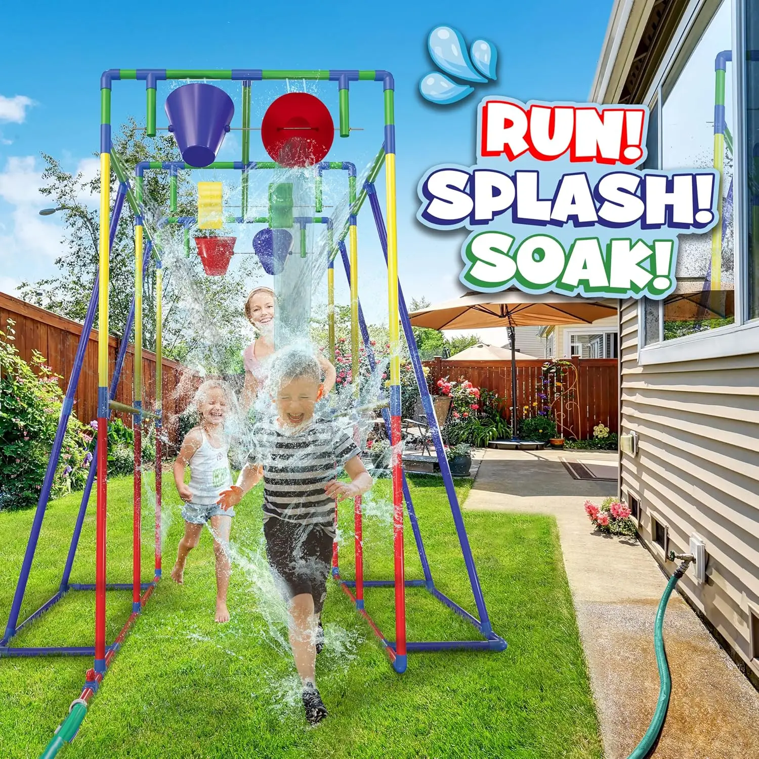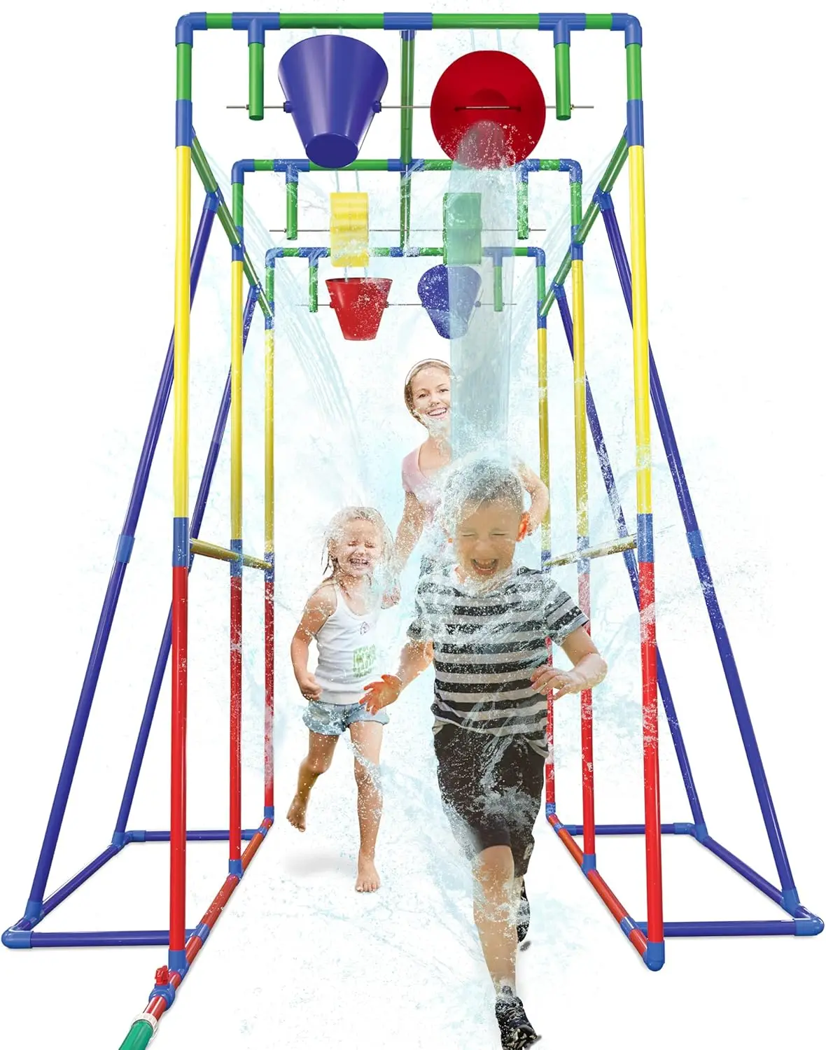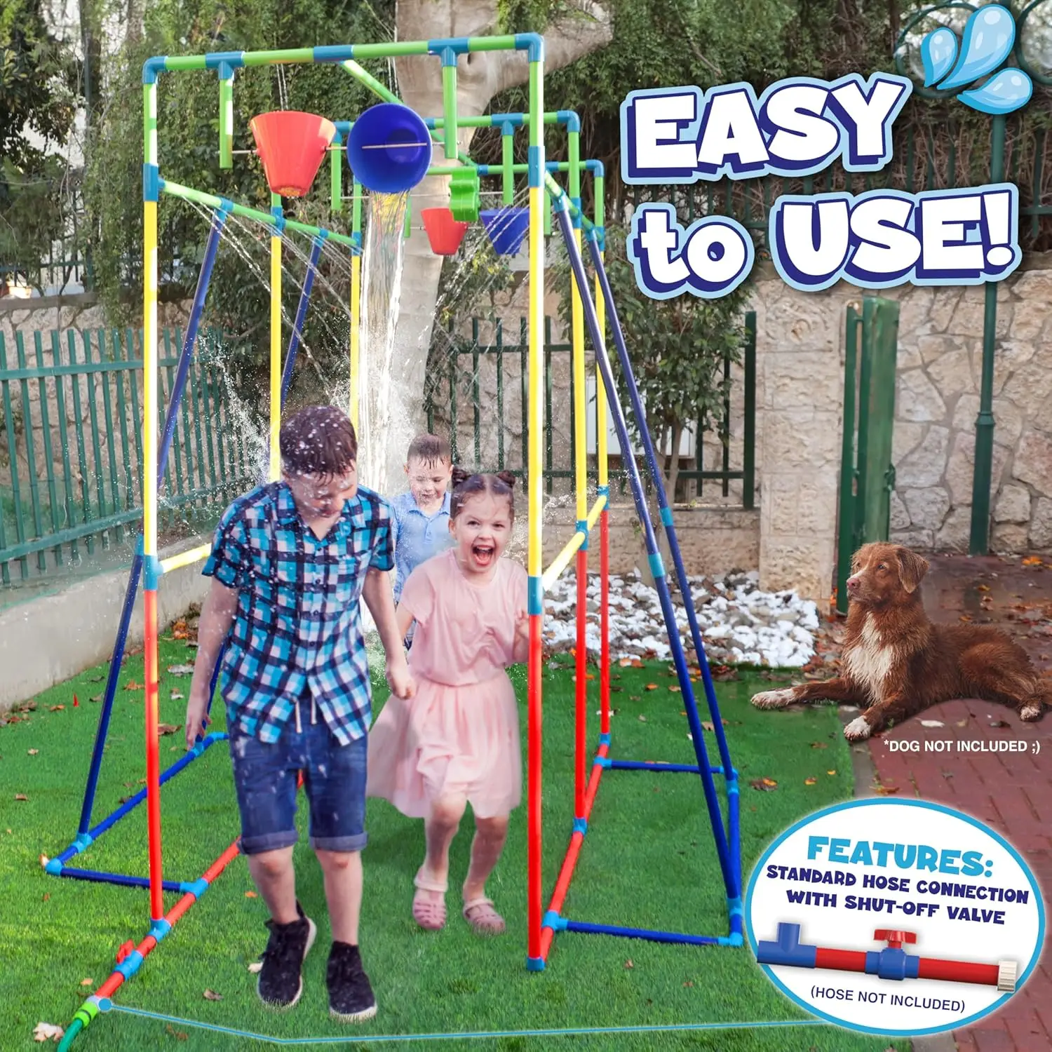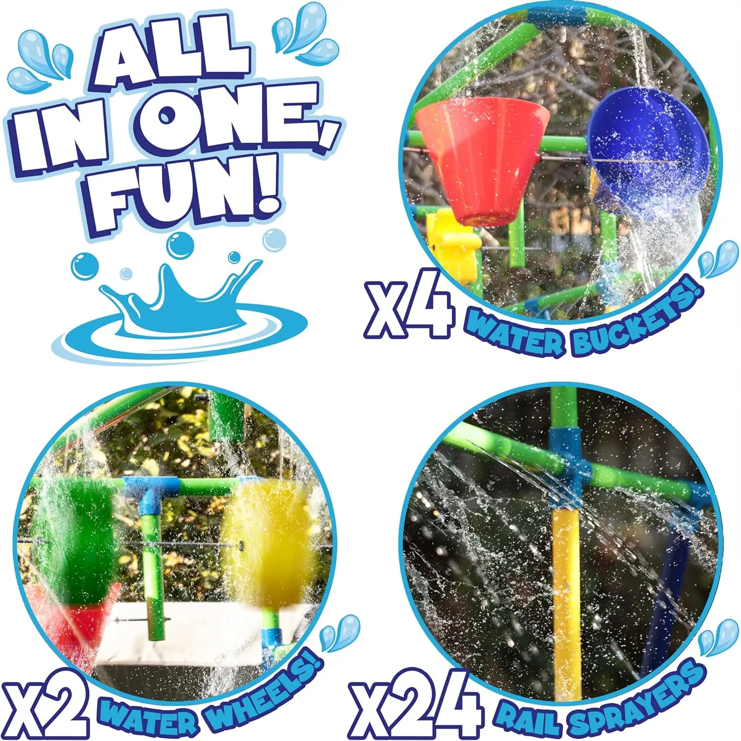 Outdoor water game for kids, garden sprinkler summer toy, fun play structure with water buckets and spray wheels, perfect for fa